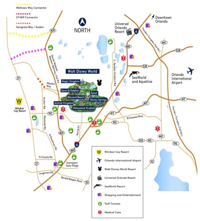 Windsor Cay ligger kun 30 minutter fra Orlando Internasjonale flyplass, på grensen mellom Davenport og Clermont langs Hwy 27 – også kalt Four Corners.