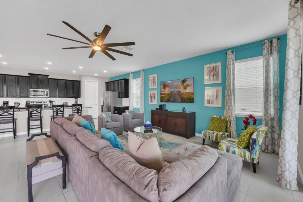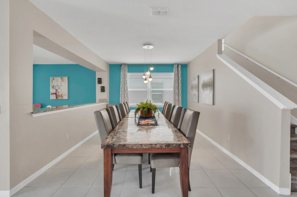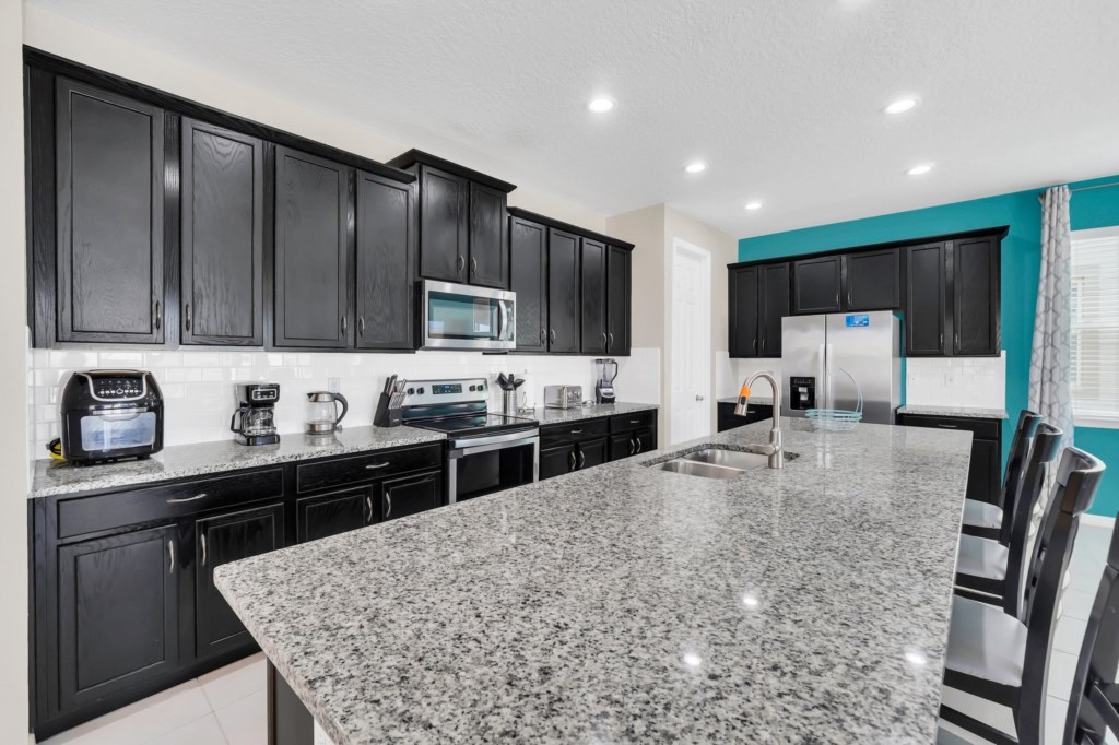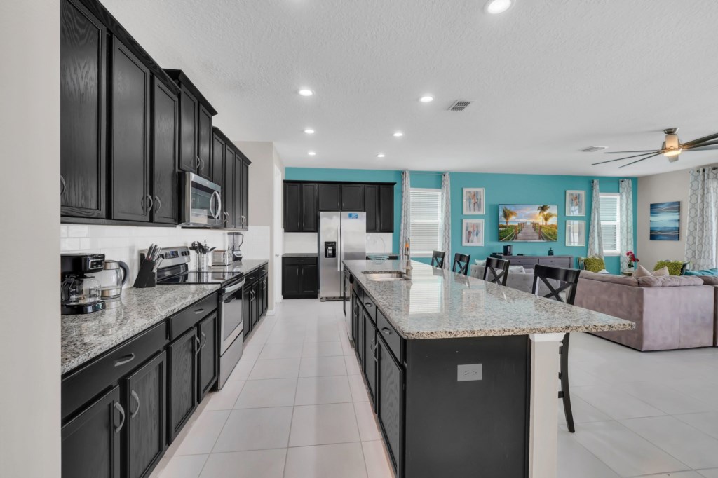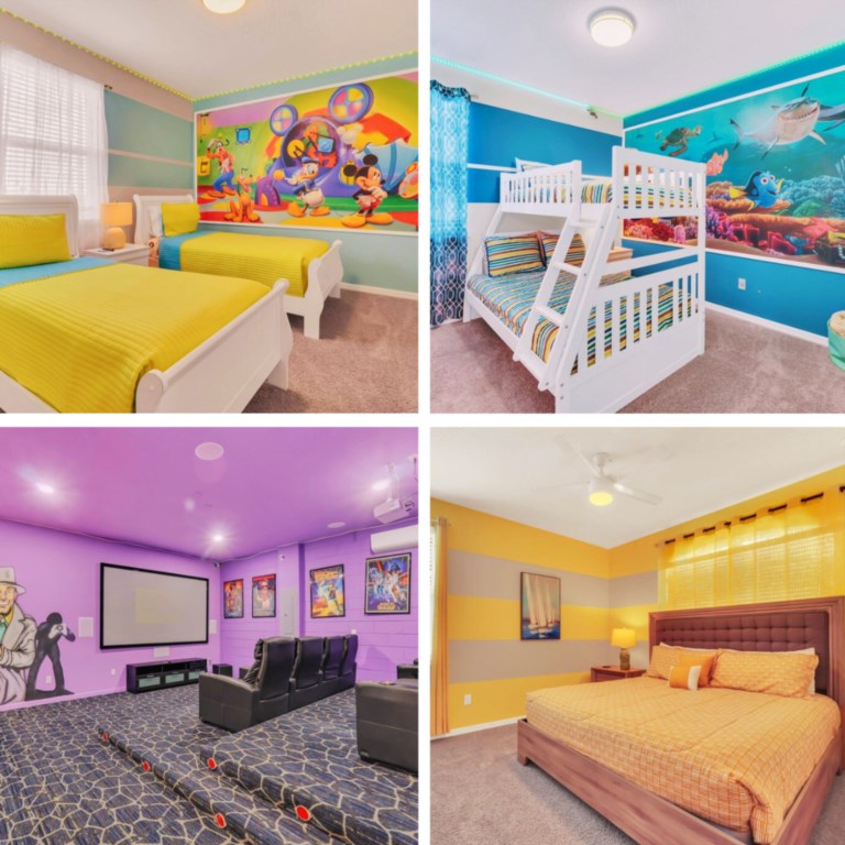 The villa features nine bedrooms, including multiple king suites, queen and full beds, and fun-themed kids’ rooms such as Frozen, Mickey’s House, and Finding Nemo. Every bedroom has its own TV, and many have private bathrooms, ensuring privacy and convenience for all guests. The open, fully equipped kitchen with granite countertops, stainless steel appliances, breakfast island, and formal dining area makes meal preparation and family dining effortless.