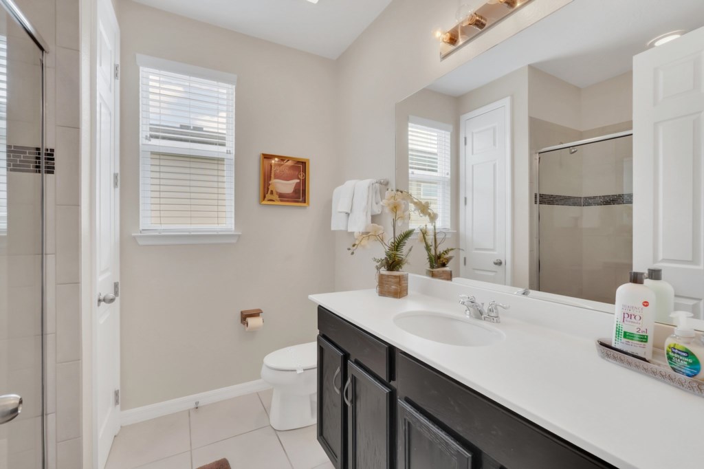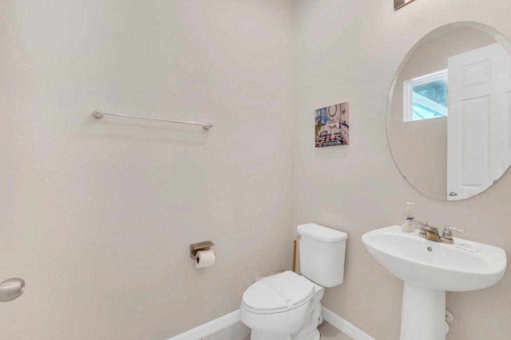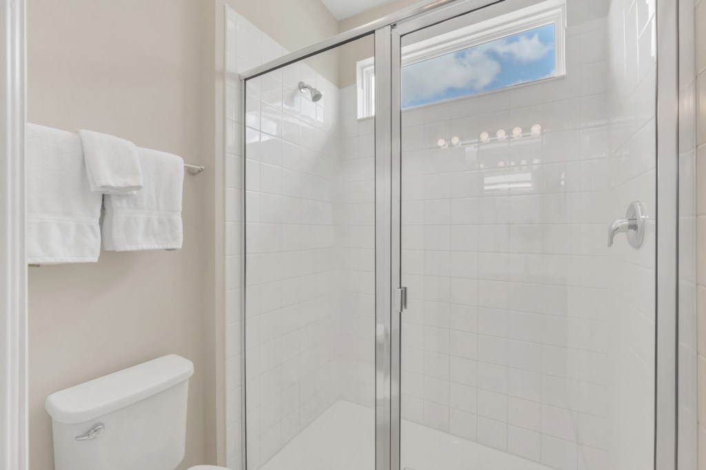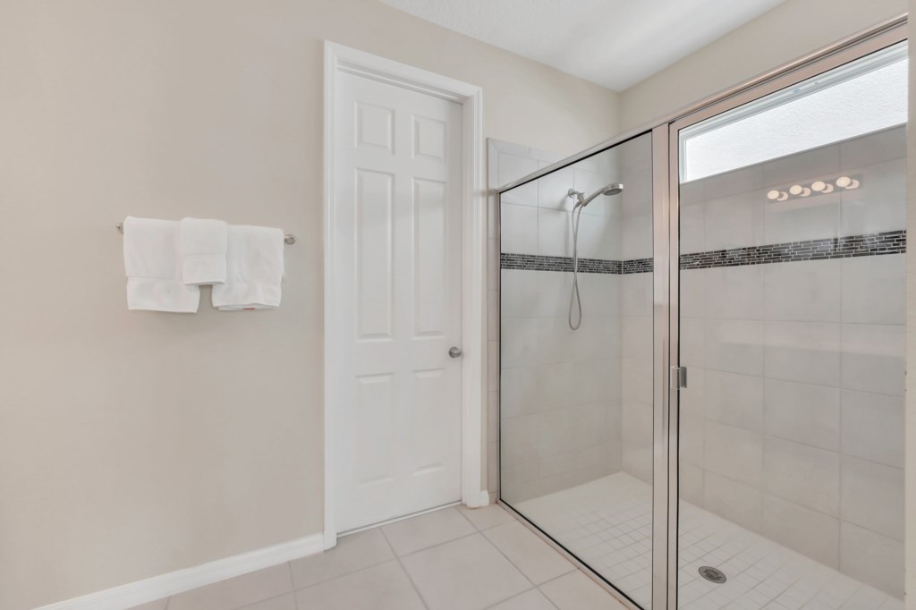 The villa features nine bedrooms, including multiple king suites, queen and full beds, and fun-themed kids’ rooms such as Frozen, Mickey’s House, and Finding Nemo. Every bedroom has its own TV, and many have private bathrooms, ensuring privacy and convenience for all guests. The open, fully equipped kitchen with granite countertops, stainless steel appliances, breakfast island, and formal dining area makes meal preparation and family dining effortless.