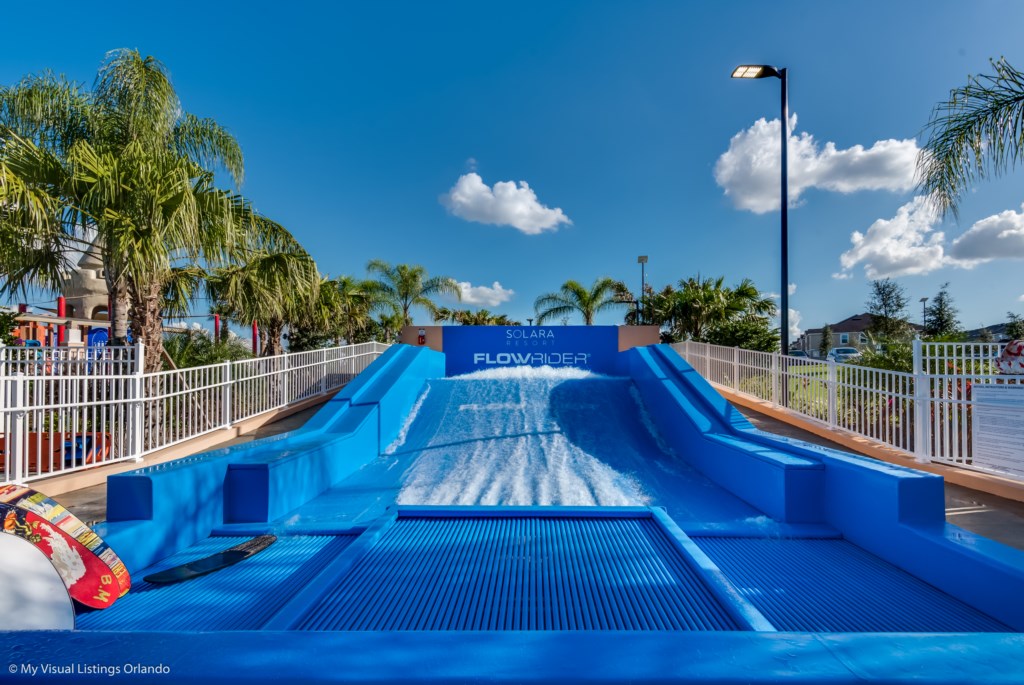 Stort basseng med "strand"-inngang, barnas basseng med splash-område samt vannsklier, og Flowrider "surfemaskin" for de modige.