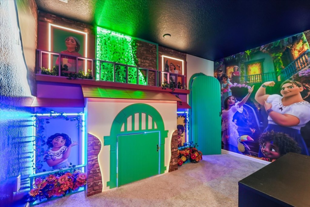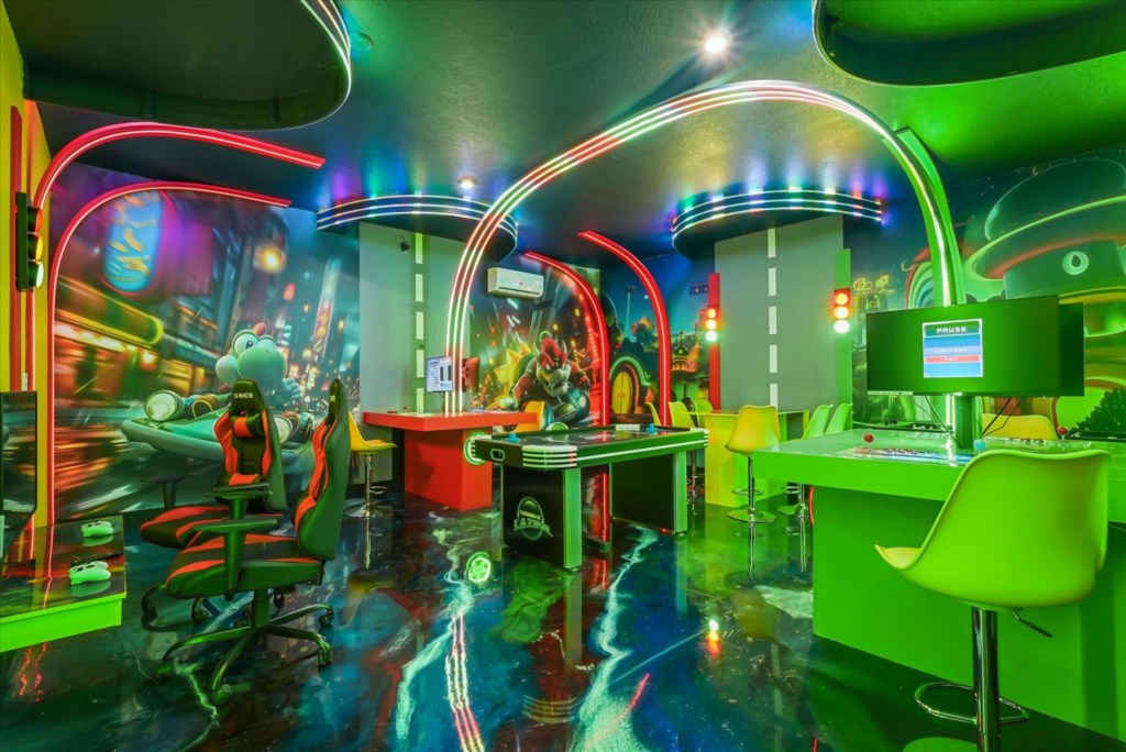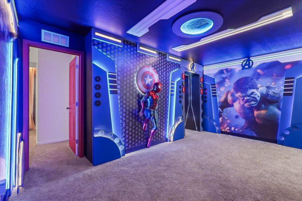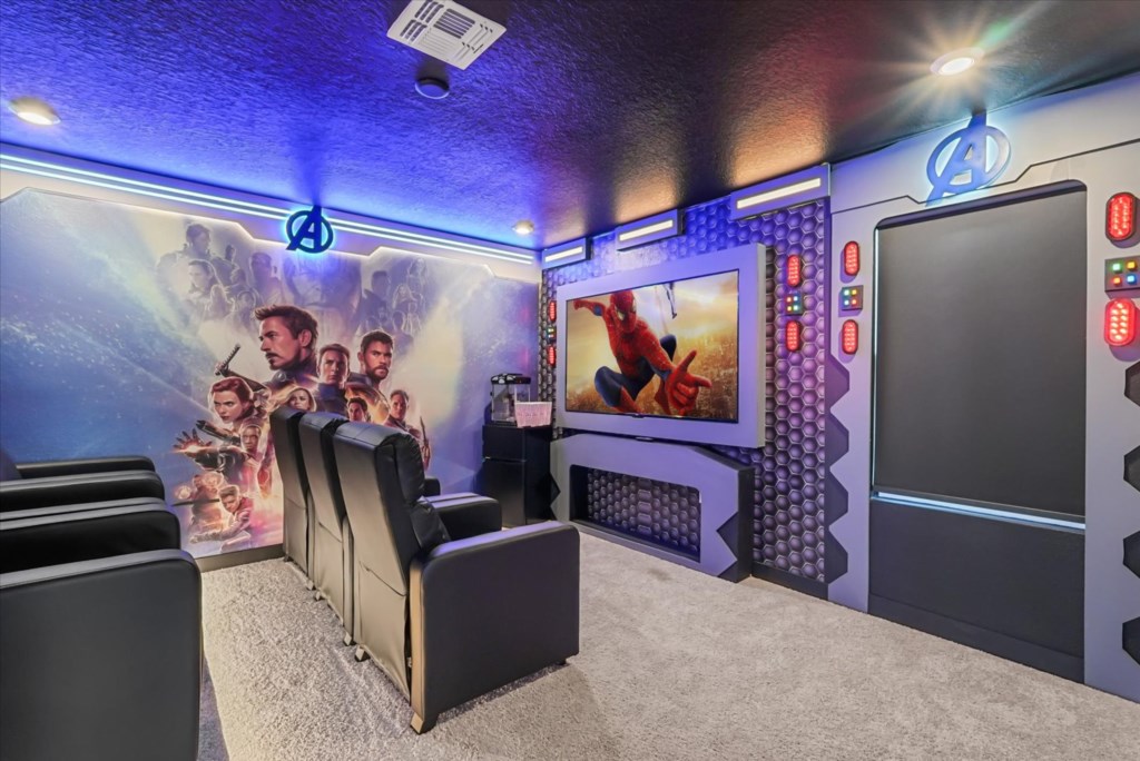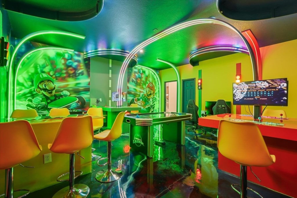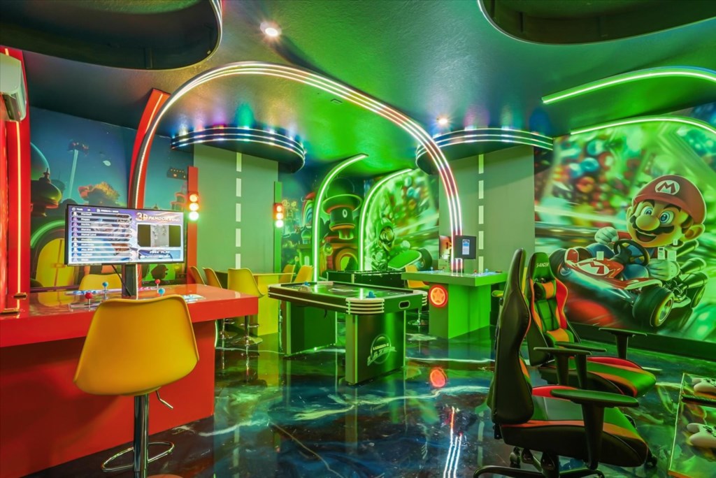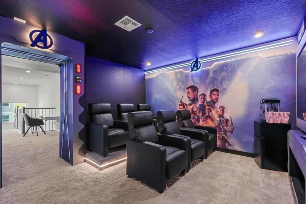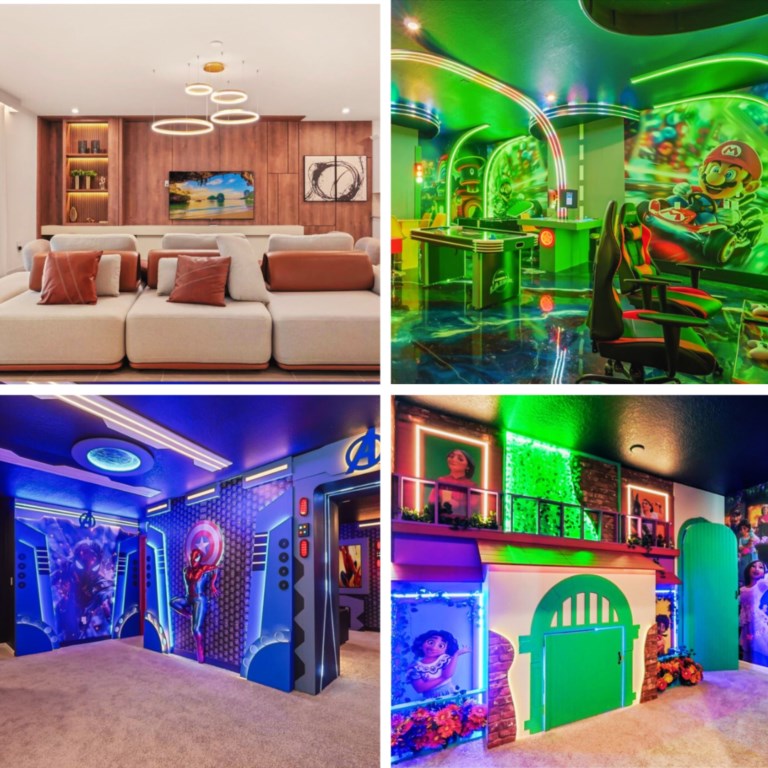 The home boasts a fully equipped kitchen with granite countertops, stainless steel appliances, a breakfast island, and a formal dining area. Kids and adults alike will love the fun themed bedrooms inspired by Mickey Adventures, Lilo & Stitch, Avatar, Encanto, and Avengers. For even more excitement, the villa features a private movie theater and a Mario Kart–themed game room with arcades and air hockey.