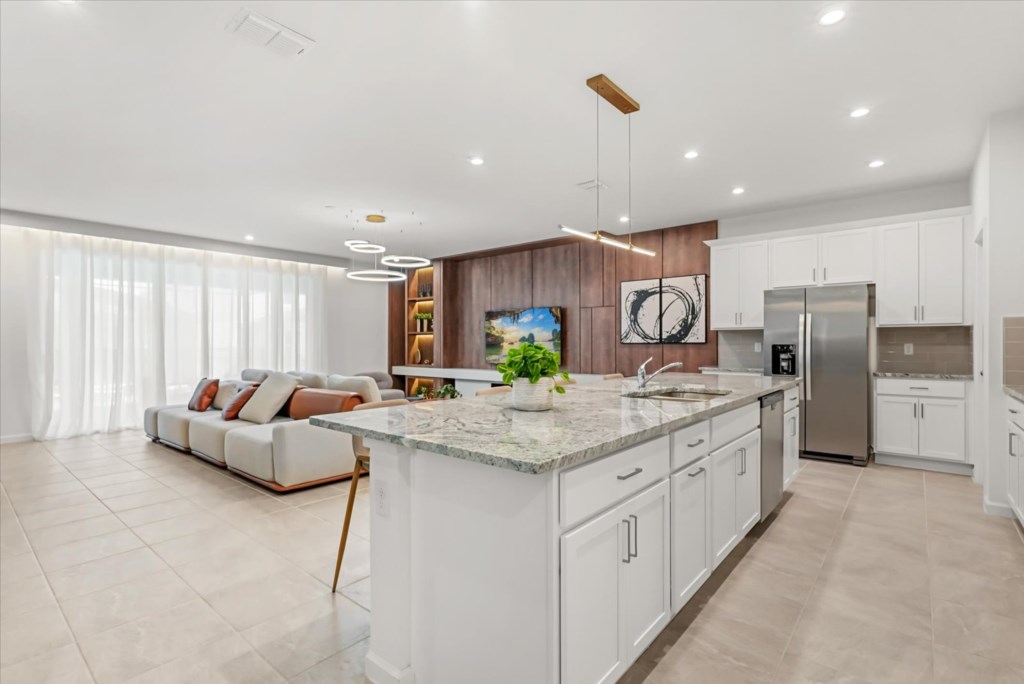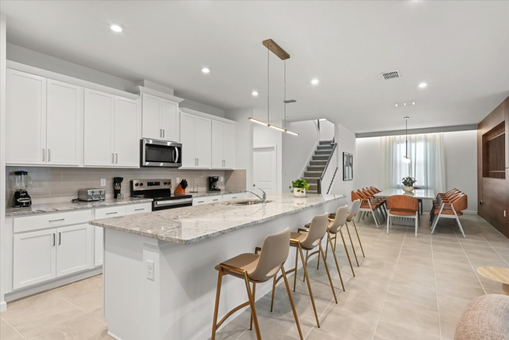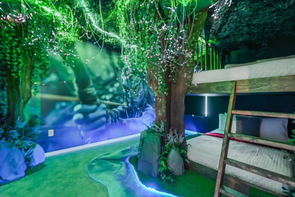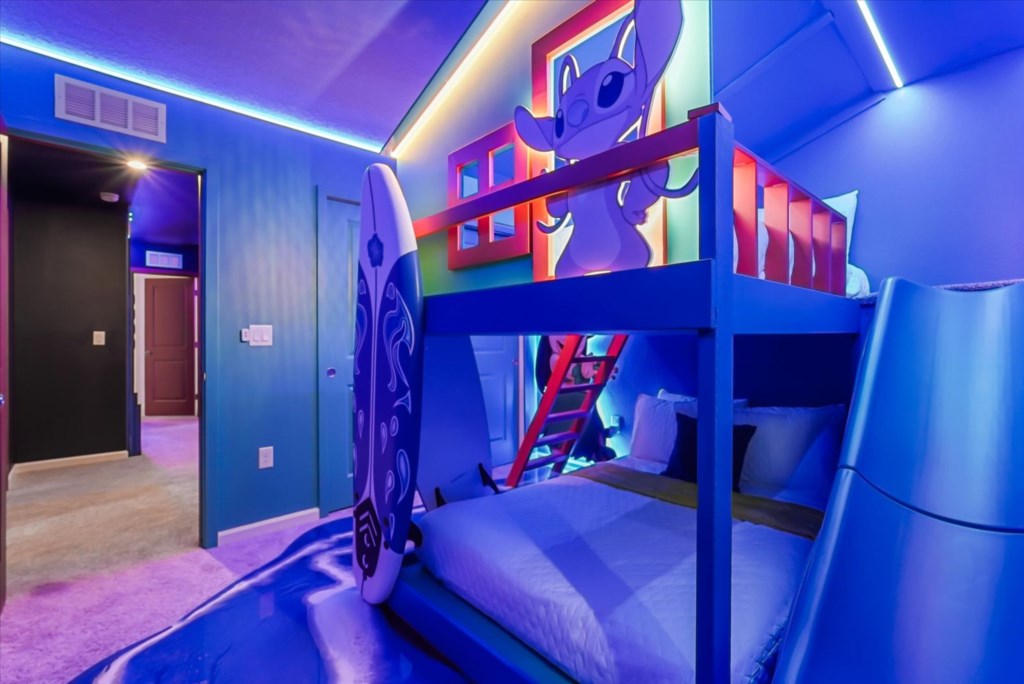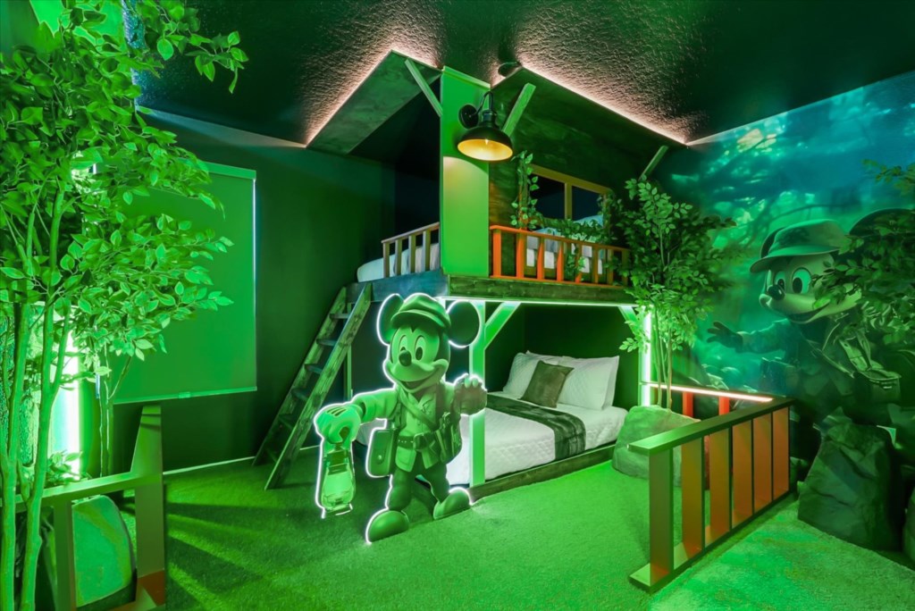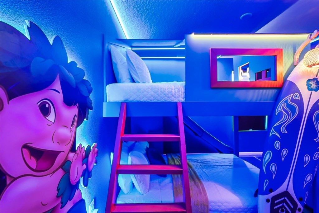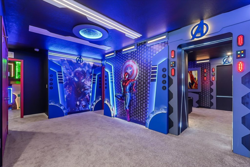 The home boasts a fully equipped kitchen with granite countertops, stainless steel appliances, a breakfast island, and a formal dining area. Kids and adults alike will love the fun themed bedrooms inspired by Mickey Adventures, Lilo & Stitch, Avatar, Encanto, and Avengers. For even more excitement, the villa features a private movie theater and a Mario Kart–themed game room with arcades and air hockey.