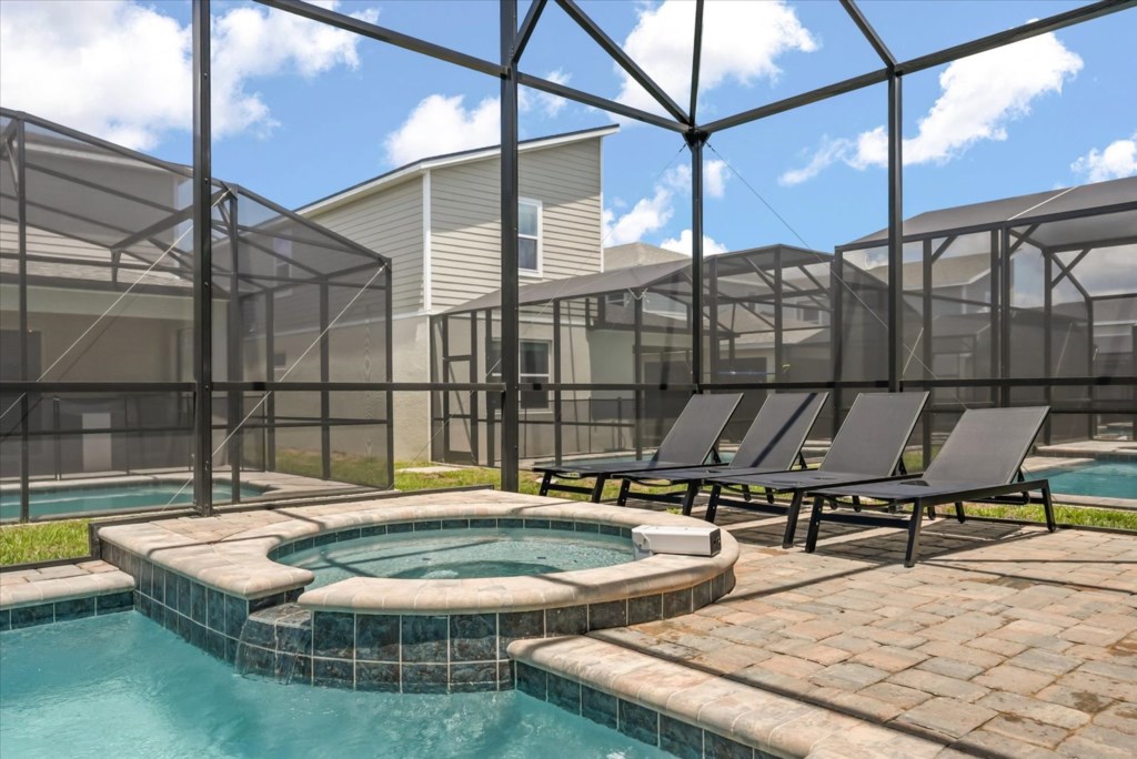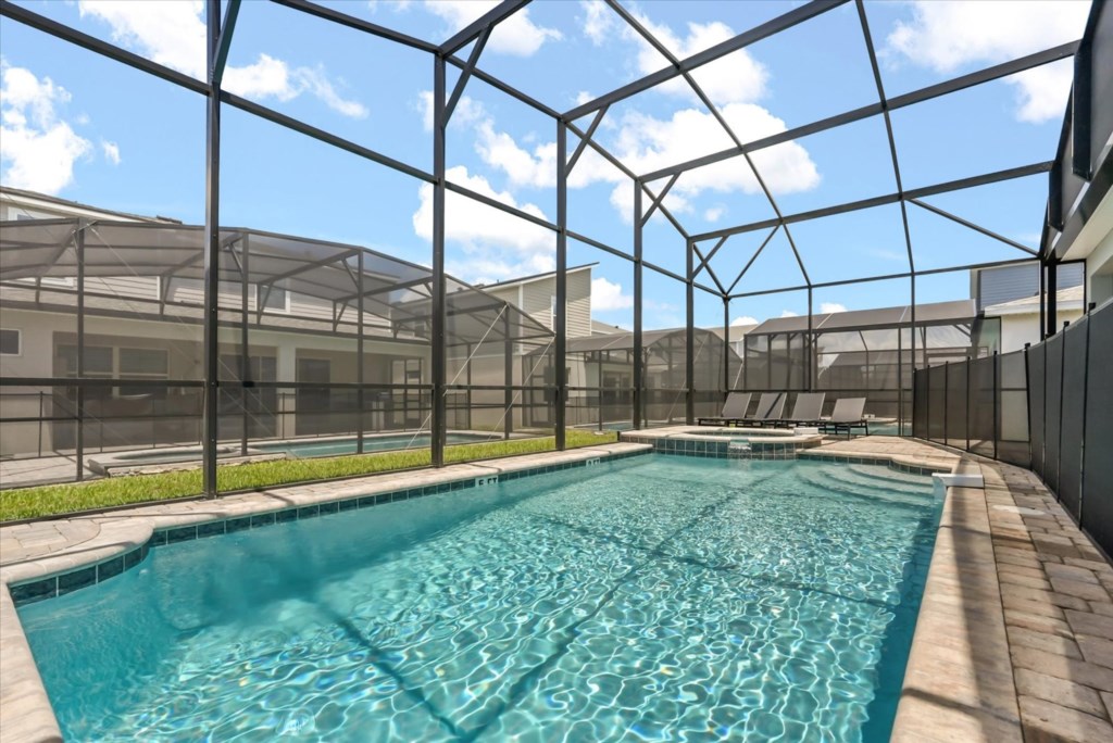 Step outside to your private screened-in pool with sun loungers, a child safety fence, and patio seating, the ideal spot to relax after a day at the theme parks. With resort-style amenities at your fingertips and Disney just minutes away, Villa Solara Luxe is the perfect place to create unforgettable vacation memories.